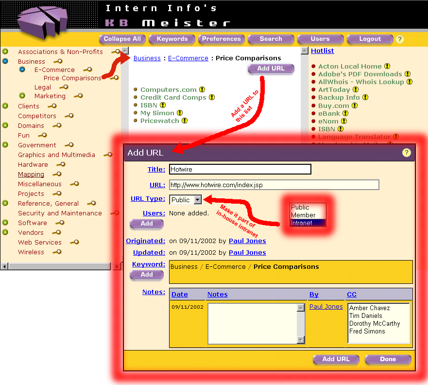 Paul types into the Title field what will remind him of the URL. The URL he obtains via a clip-and-paste from his browser. In this example, he also decides Hotwire is for in-house viewing only (not for the Intern Info public), so he changes the URL Type to "Intranet". Click on the Add URL User slide to see how Paul enters himself as a Hotwire user with his own user ID and password. |