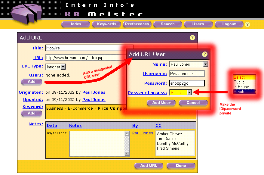 Another reason someone may add their name to a URL's users list is to identify it as a URL they want in their own version of KB Meister. Later on the Preferences and Search slides, Paul will be able to display only those URLs he has selected as a regular user (even when they are entered into KB Meister by a co-worker). Click on the Add to Keyword slide to see how Paul adds the URL to additional keywords so it can be found wherever users look for it. |
