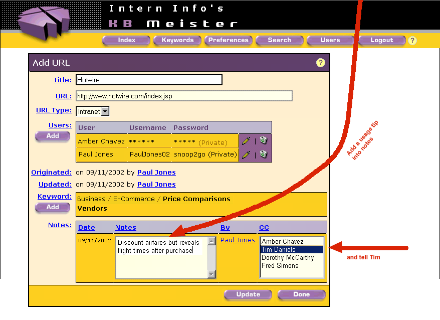 Before Paul clicks the Update button, he remembers that Tim Daniels is looking to fly to NY on Intern Info business. Paul selects Tim in the cc picklist, and KB Meister will automatically send him an advisory about the Hotwire URL. Click on the View URL Data slide to see how anyone later visiting the Intern Info portal will see the URL Paul just added. |