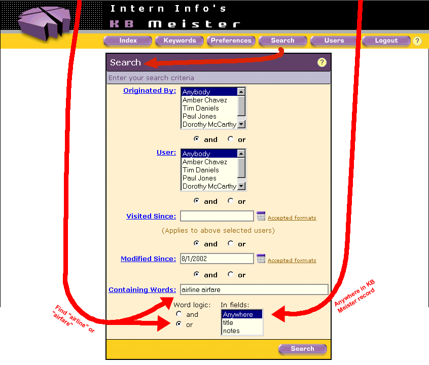 In the example below, Paul is looking for an airplane ride and types "airline airfare" in the Containing Words field. The "or" in the Word logic option below indicates that a URL with either word is OK. By leaving "Anywhere" in the In fields picklist, Paul will accept a URL whether "airline" or "airfare" is in the Title or anywhere in its Notes. Click on the Search Results slide to see what Paul sees after he clicks the Search button. |